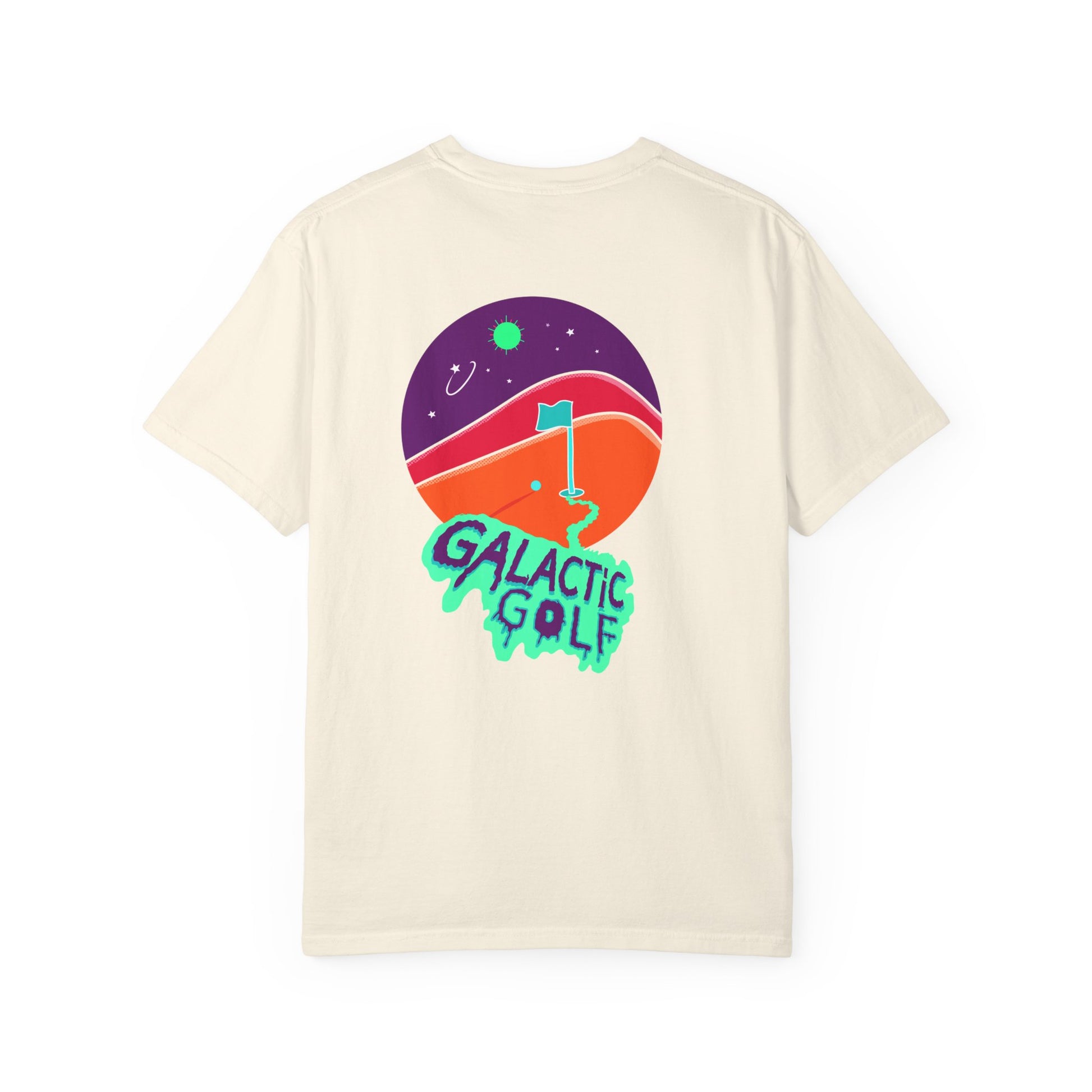 Lightweight but substantial, this garment-dyed tee carries a lived-in softness and a relaxed silhouette that invites long days outdoors and late-night hangs. The front carries a small, energetic chest wordmark while the back bursts with a playful ‘Galactic Golf’ illustration — neon greens, hot coral dunes and a starry purple sky — that feels equal parts retro arcade and sunlit course. It wears like an old favorite but looks like a statement: effortless, slightly nostalgic, and full of personality. Throw it on for a round with friends, a weekend drive to the coast, or when you want a bit of cosmic mischief in your everyday rotation.